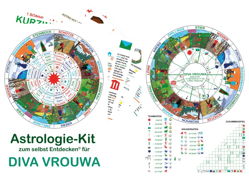 beinhaltet das Astrologie-Kit Mini, also deinen Horoskopkreis und einige Informationsblätter, außerdem noch einen Gutschein für einen Zoom-Kurs, in dem wir die Methoden der Astrologie spielerisch erarbeiten. Erweitert wird es durch die Beschreibung der 13 Teammitglieder und der 12 Häuser auf je einem eigenen Blatt.